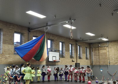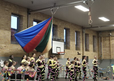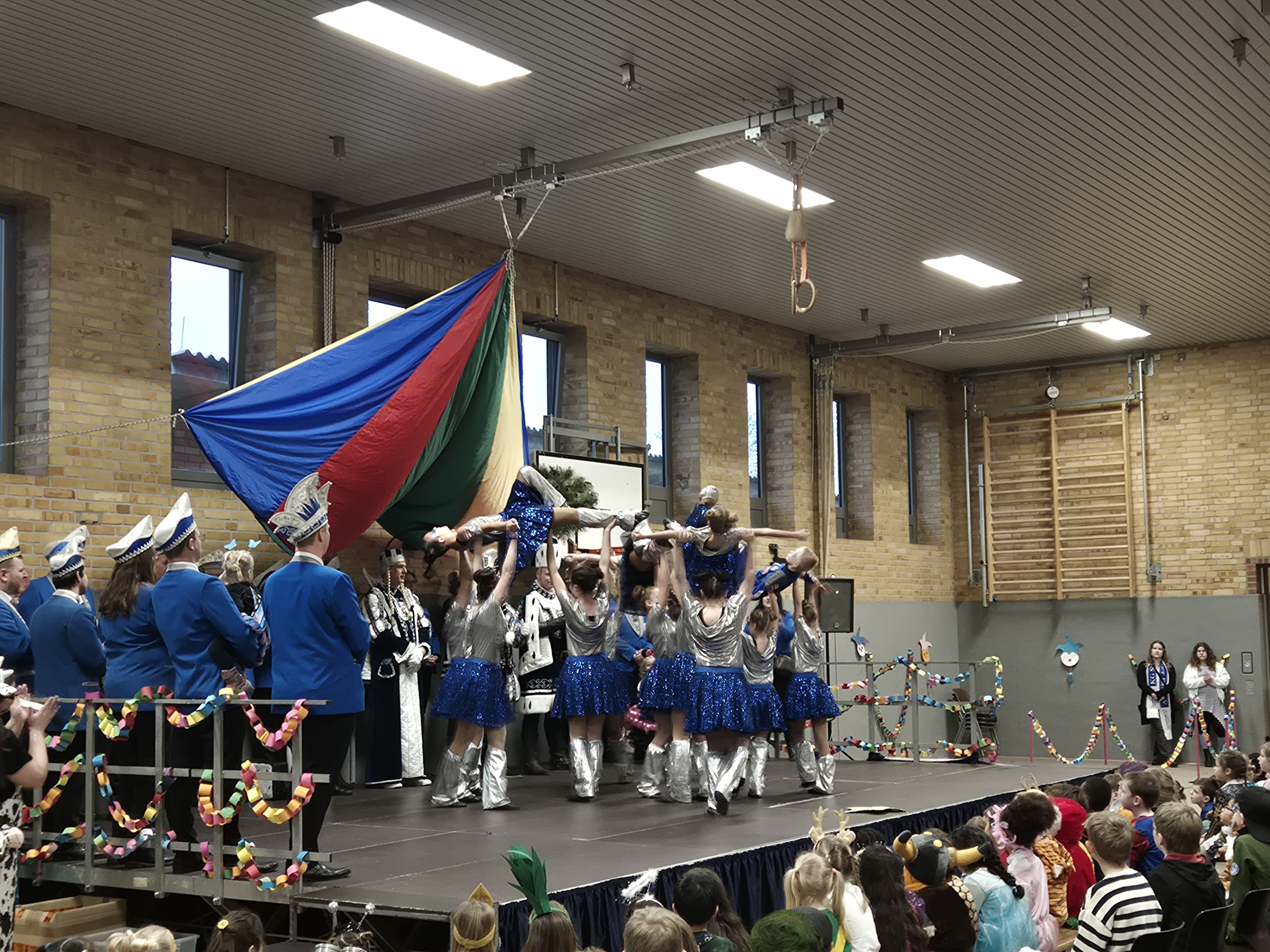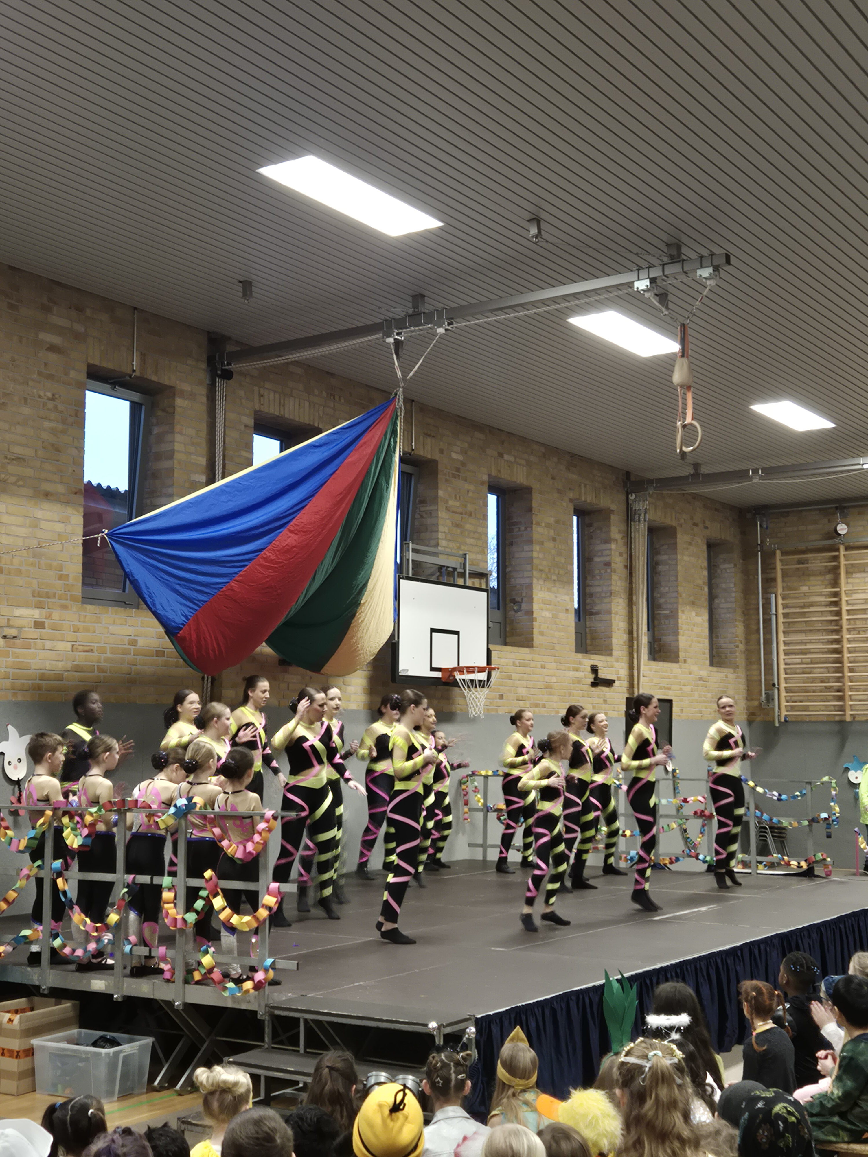 In der Turnhalle wartete anschließend ein abwechslungsreiches Programm, das für beste Stimmung sorgte. Mit schwungvollen Tänzen und tollen Darbietungen begeisterten die eingeladenen Karnevalsgruppen die Kinder und sorgten für viel Applaus. Für diese tolle Unterstützung möchten wir uns herzlich bedanken, denn sie machte den Karnevalstag zu einem besonderen Erlebnis für die ganze Schulgemeinschaft. Danach wurde in den Klassenräumen weitergefeiert. Bei Spielen, Musik und leckeren Snacks kam echte Karnevalsstimmung auf. Ein Höhepunkt durfte natürlich nicht fehlen: die traditionelle Polonaise! Aufgrund der Bauarbeiten führte sie in diesem Jahr rund um das Schulgelände, begleitet von fröhlicher Musik und ausgelassener Stimmung.