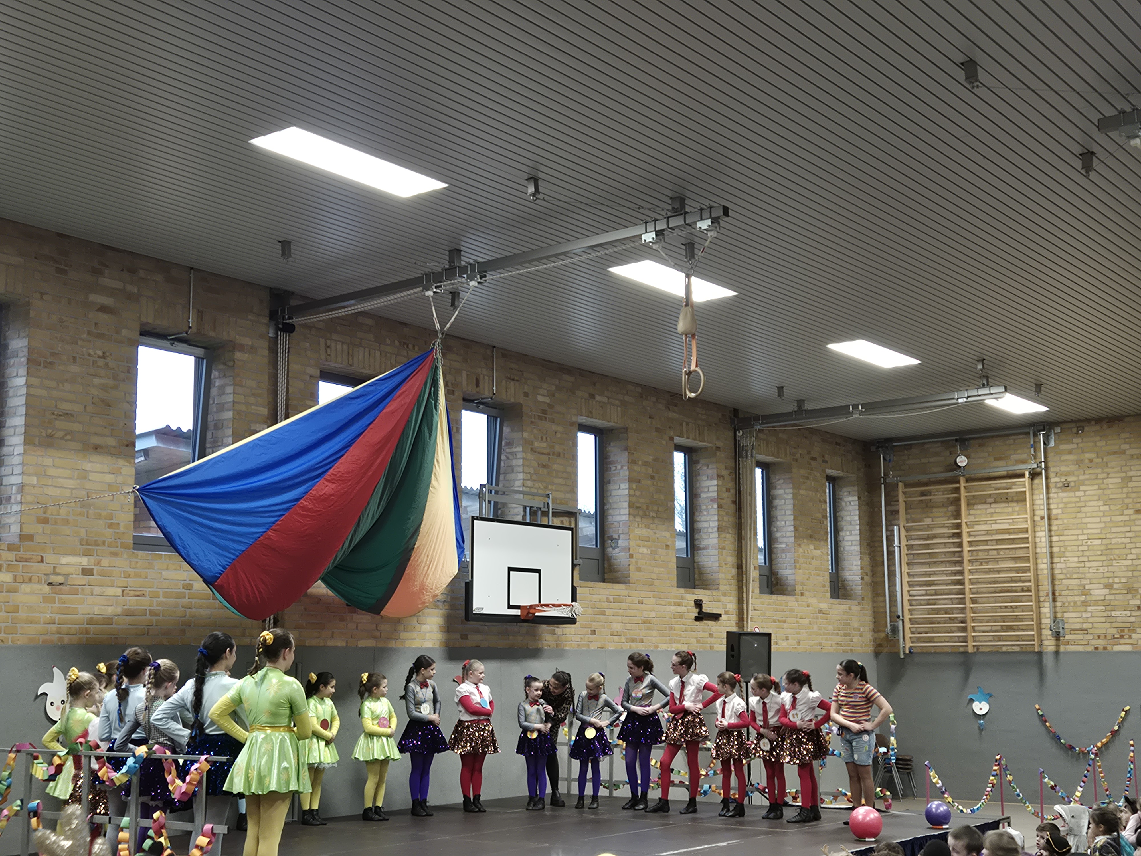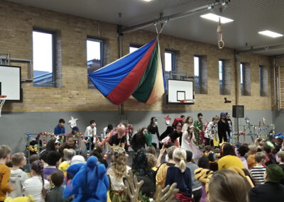 In der Turnhalle wartete anschließend ein abwechslungsreiches Programm, das für beste Stimmung sorgte. Mit schwungvollen Tänzen und tollen Darbietungen begeisterten die eingeladenen Karnevalsgruppen die Kinder und sorgten für viel Applaus. Für diese tolle Unterstützung möchten wir uns herzlich bedanken, denn sie machte den Karnevalstag zu einem besonderen Erlebnis für die ganze Schulgemeinschaft. Danach wurde in den Klassenräumen weitergefeiert. Bei Spielen, Musik und leckeren Snacks kam echte Karnevalsstimmung auf. Ein Höhepunkt durfte natürlich nicht fehlen: die traditionelle Polonaise! Aufgrund der Bauarbeiten führte sie in diesem Jahr rund um das Schulgelände, begleitet von fröhlicher Musik und ausgelassener Stimmung.