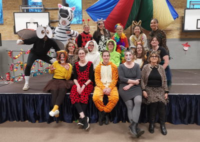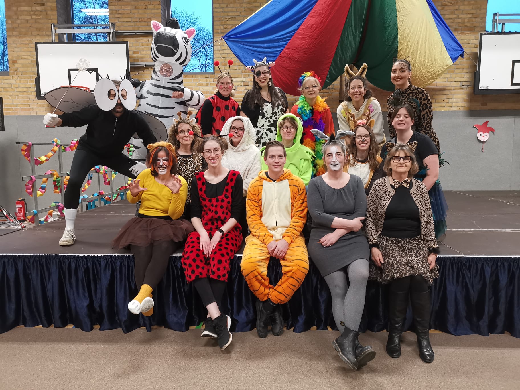 Schon beim Betreten der Schule war klar: Heute ist kein gewöhnlicher Schultag! Die Grundschule verwandelte sich in ein buntes Karnevalsparadies, in dem Ritter, Prinzessinnen, Superhelden, Tiere und viele weitere fantasievolle Figuren fröhlich durcheinanderliefen. Passend zum Motto „Karneval der Zootiere“ erschien auch das Kollegium tierisch verkleidet: Zebras, Löwen, Tiger, Antilopen, Giraffen und viele weitere Zootiere sorgten für staunende Blicke und jede Menge gute Laune.